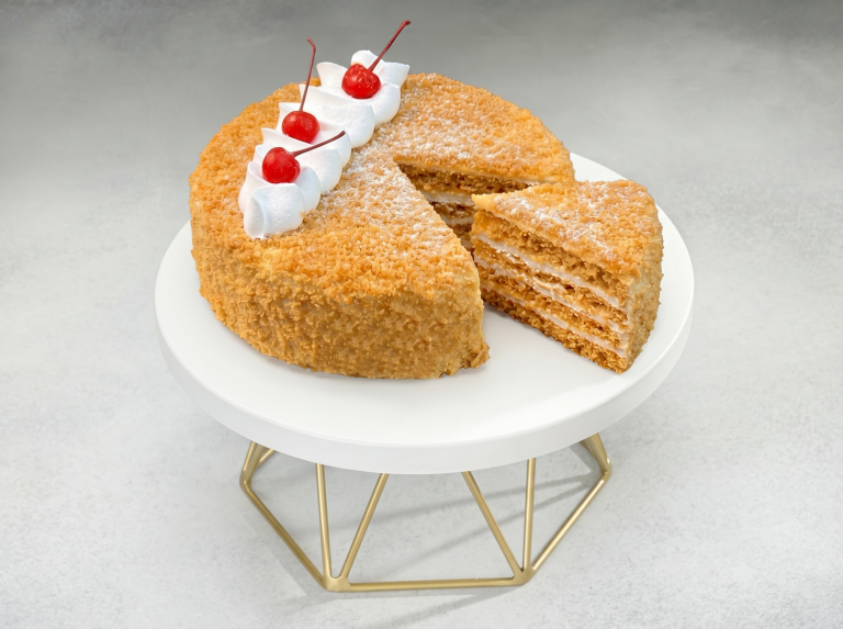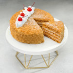 Медовый бисквит, сметанный крем, декорирован коктейльной вишней
